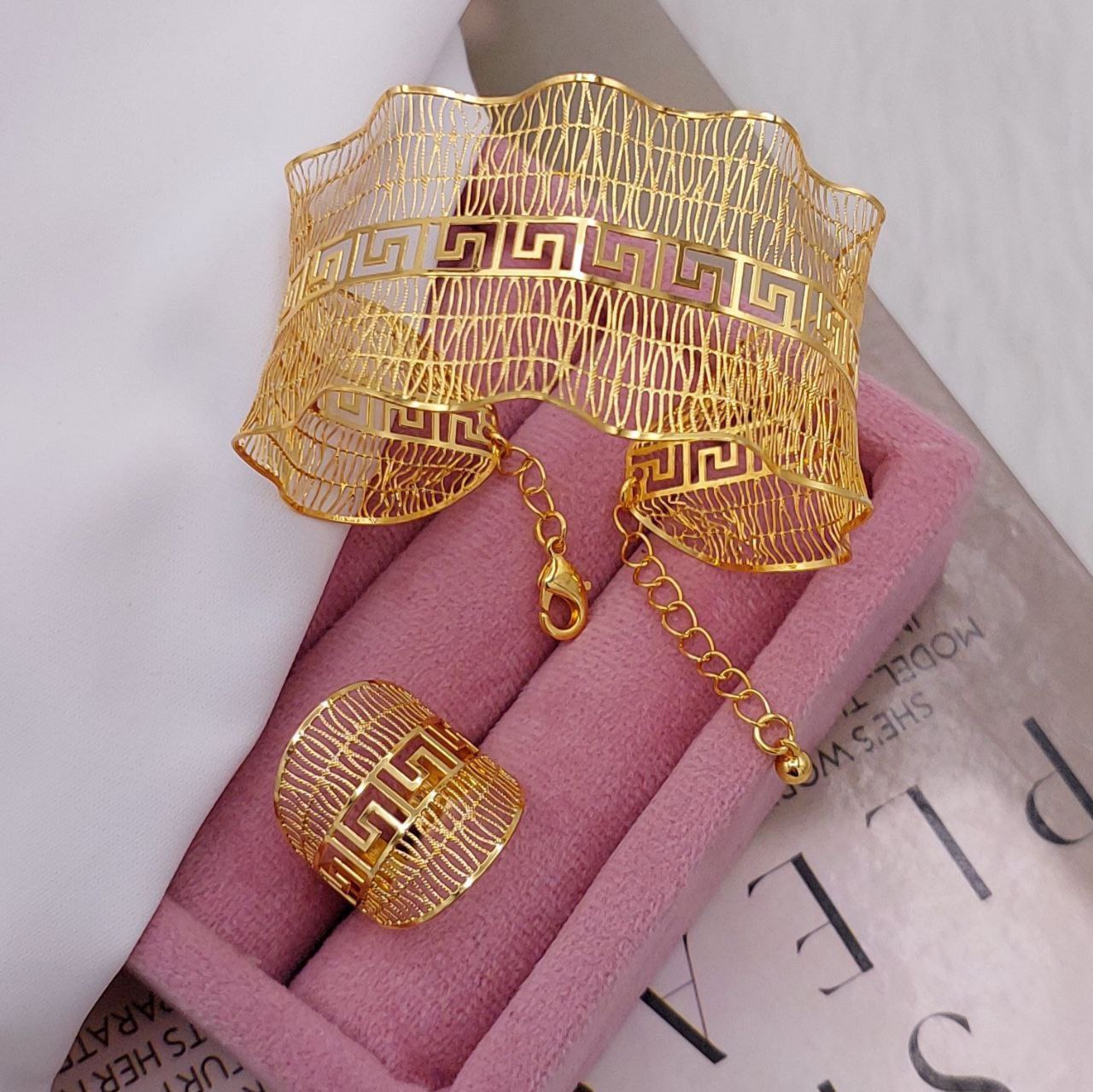ست دستبند و انگشتر بحرینی فری سایز آبکاری طلا